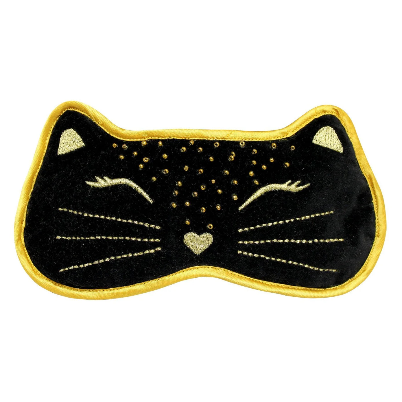 Escape into a dreamy nights sleep with this luxuriously comfortable kitty eyemask. A great gift for every cat lover. Delicately embroidered on black velvet with gold highlights and seed beading. Black satin backing.