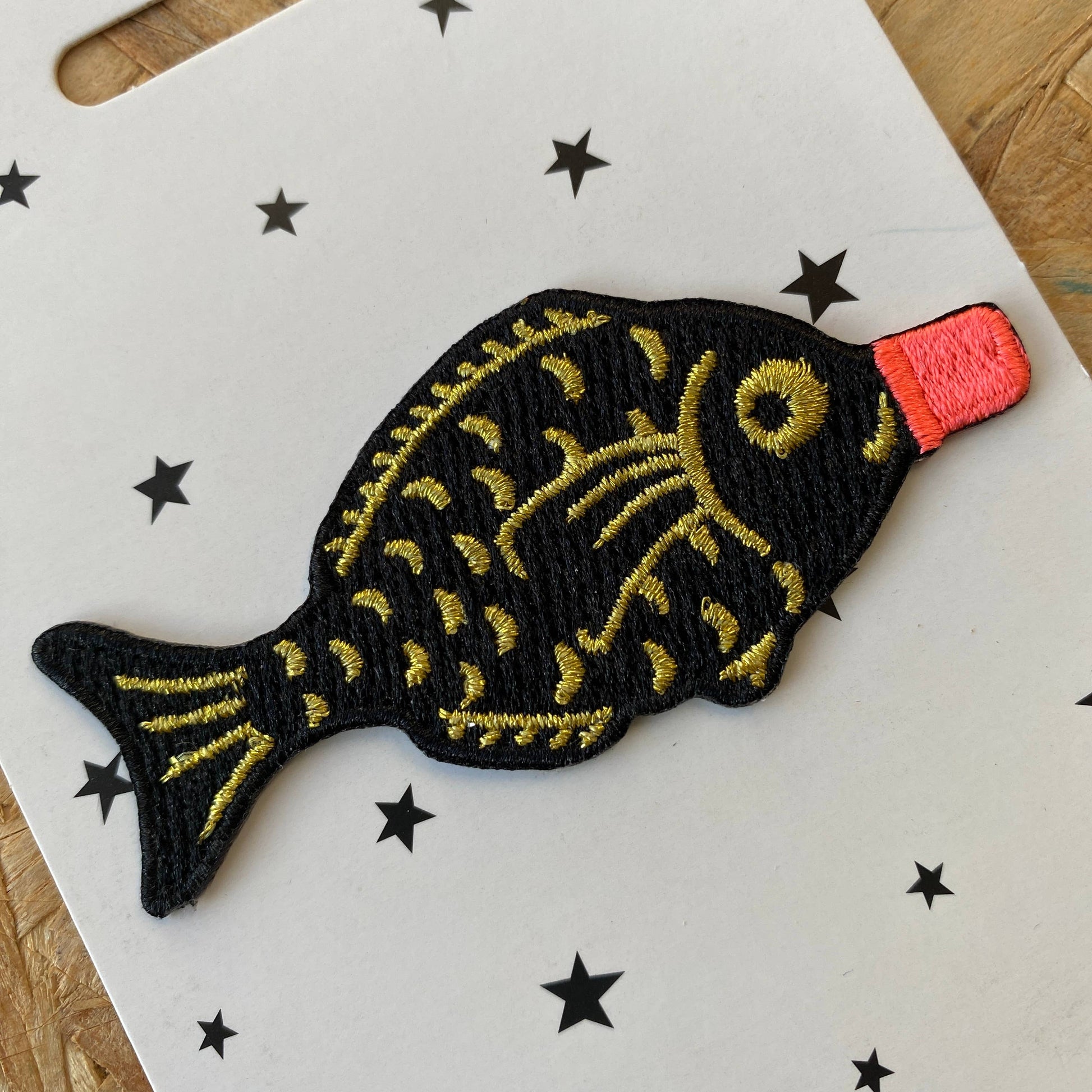 A richly embroidered fabric 'Soy sauce bottle' patch. The patch has an iron-on backing so can be removed from the card and ironed straight on to the fabric or sewn on with a few hand stitches.