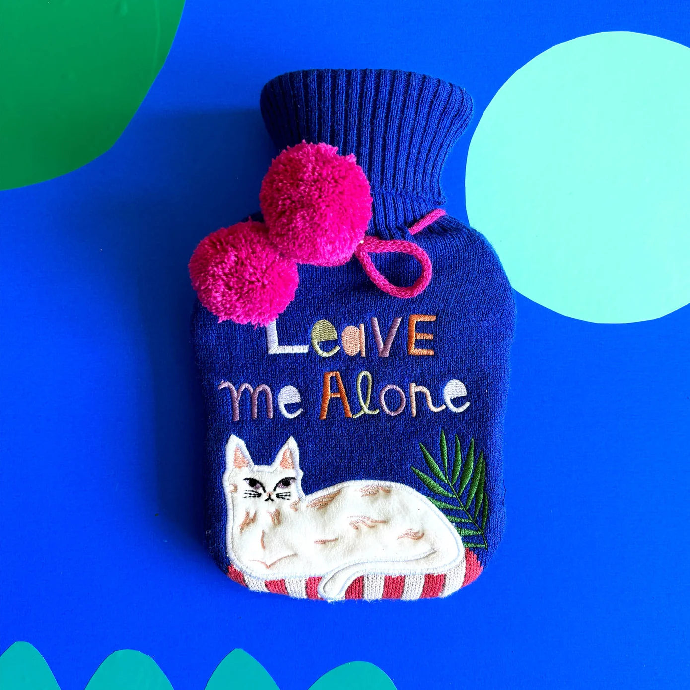 This adorable hot water bottle is the purr-fect cold-weather essential for any cat lover. Emblazoned across the front are the words “leave me alone” (who else can relate?), with a super soft cat patch reclining lazily underneath. This velvety kitty is accompanied by an embroidered house plant, and a stripy knitted bed.