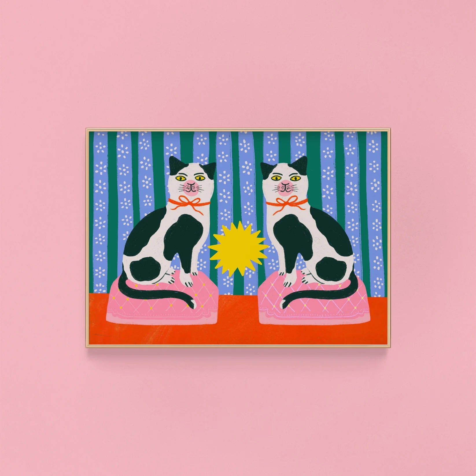 A playful art print featuring two classic Staffordshire ceramic cats set against a vibrant, whimsical patterned background. Perfect for lovers of quirky decor, vintage charm, and feline flair.