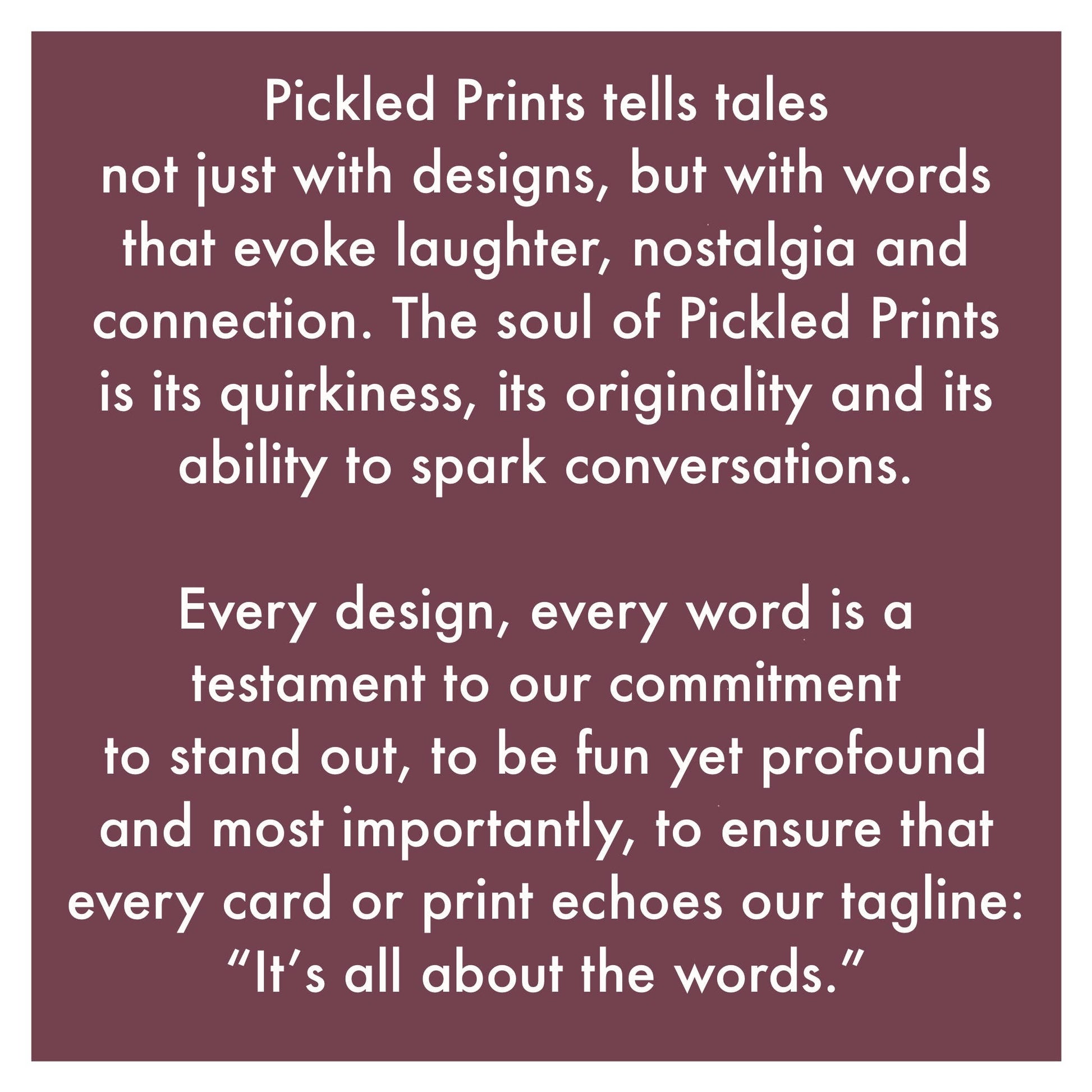Pickled Prints is all about the words and words are the most important thing at Christmas. This hilariously original design is a festive take on their everyday birthday design! This product is made from gorgeous, Old Mill high quality card stock and the image brings a vibrant, stand-out feature to the card.
